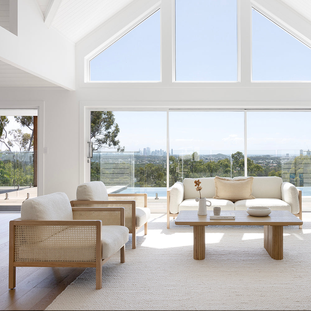 Killara Indoor Cream Boucle Couch Fabric and Timber 3+1+1 Rattan Lounge Sofa Setting
