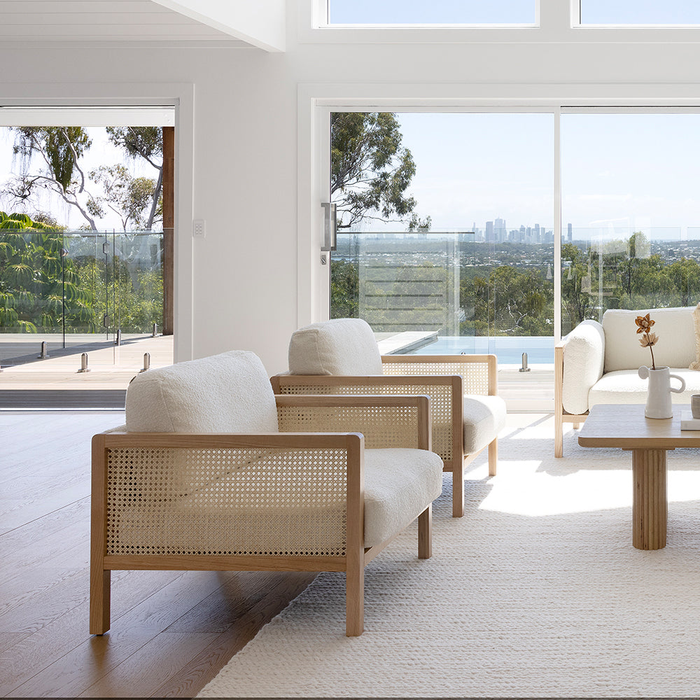 The Killara Indoor Cream Boucle Couch Fabric and Timber Arm Chair Rattan Lounge Sofa is an outdoor lounge seating piece designed for relaxed comfort.