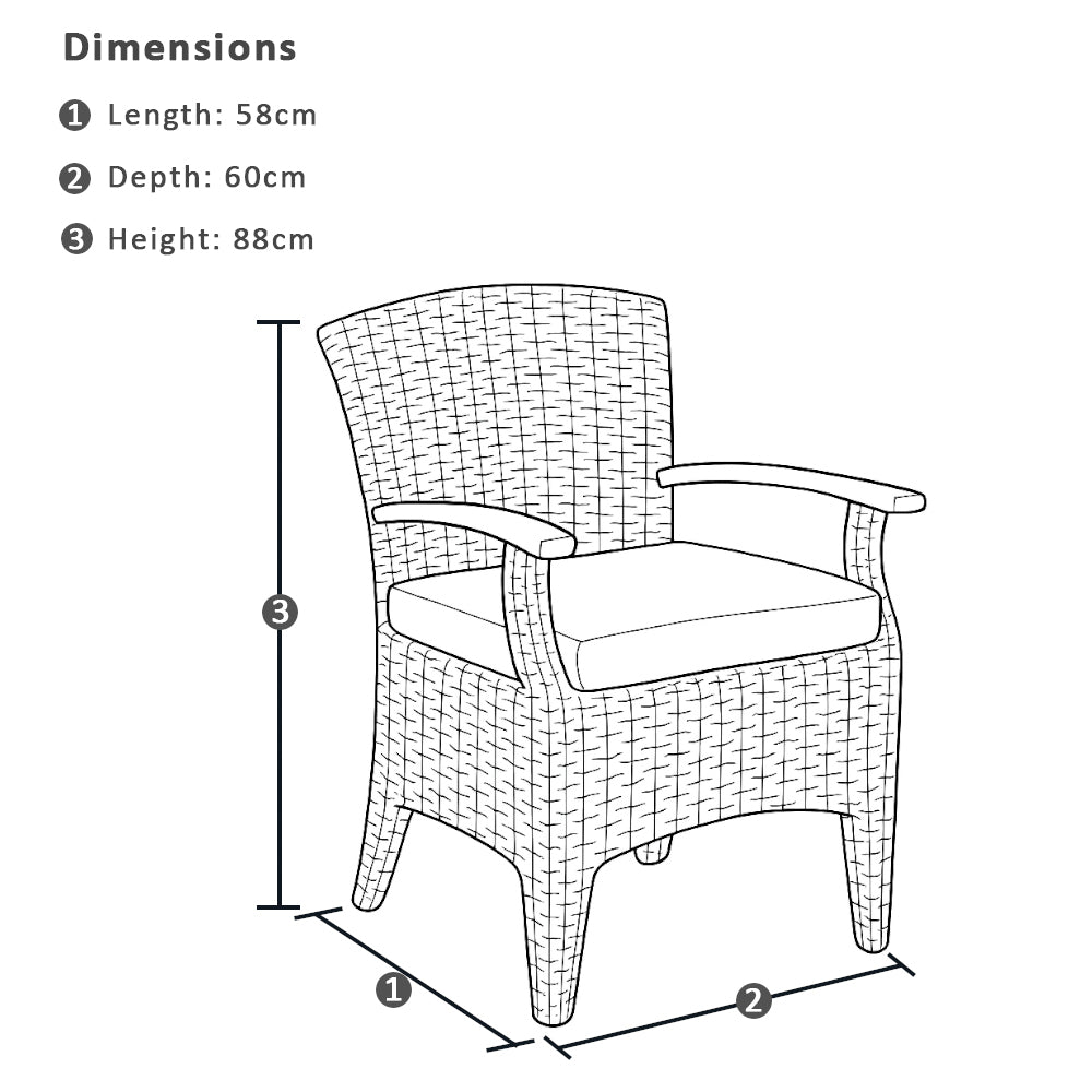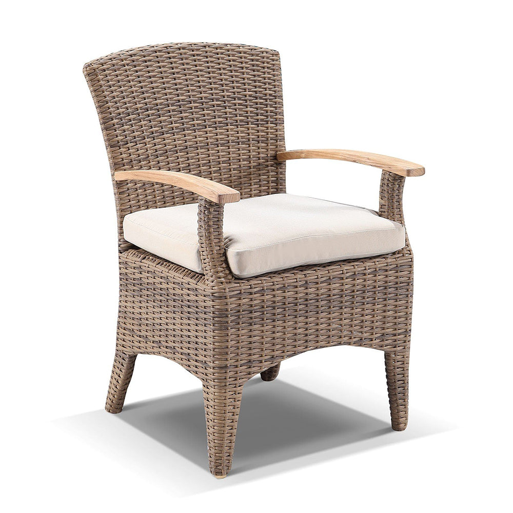 The Kai chairs feature durable wicker construction complemented by elegant teak armrests, offering both lasting comfort and timeless style.